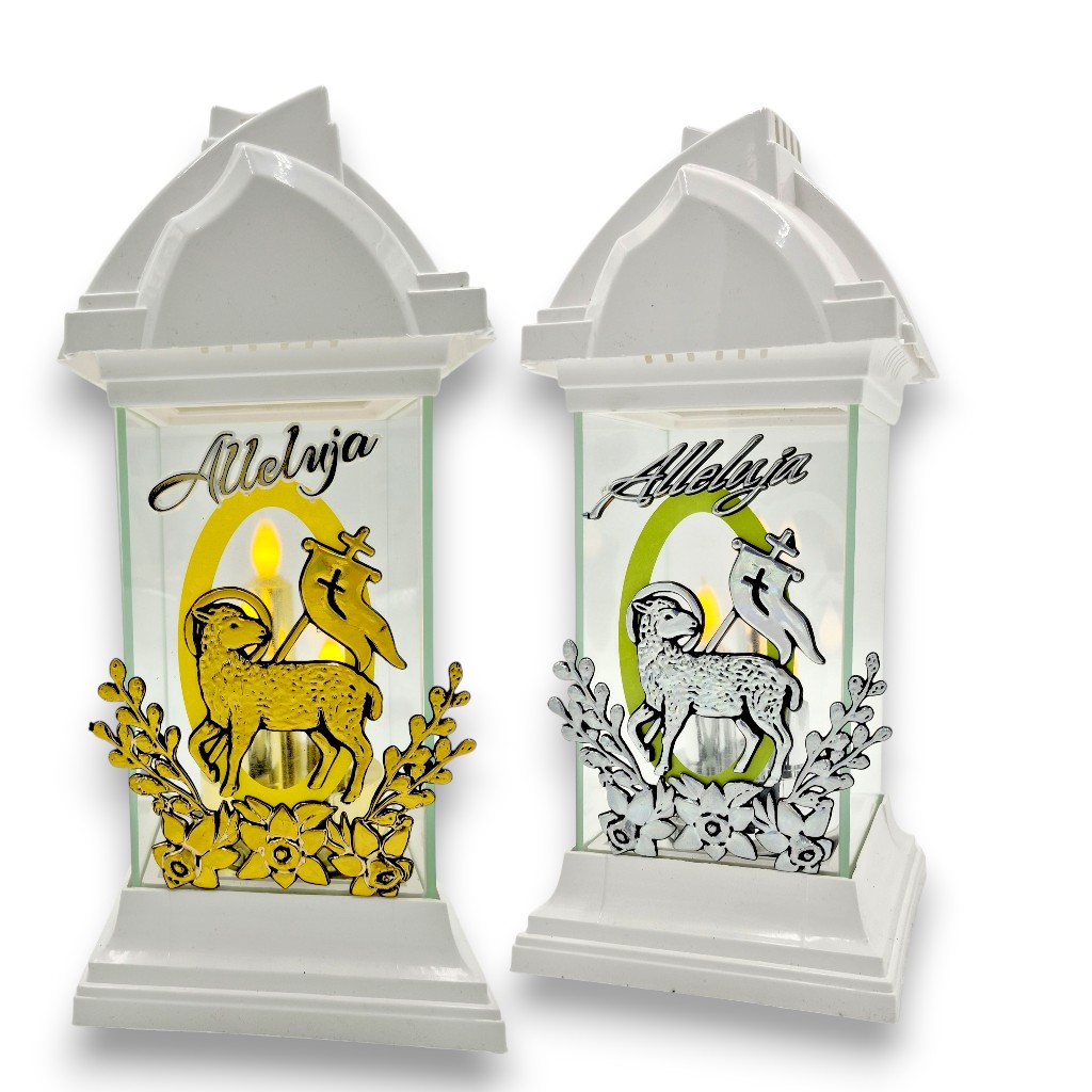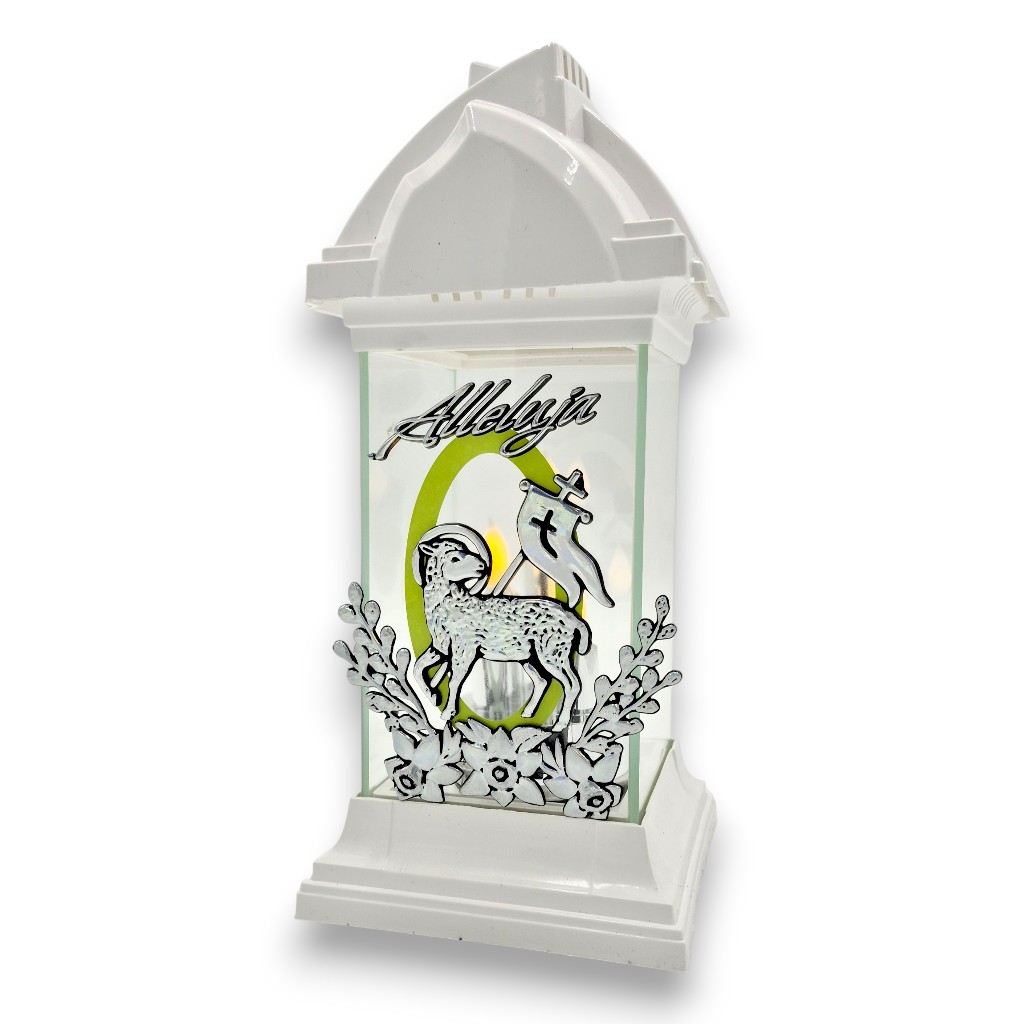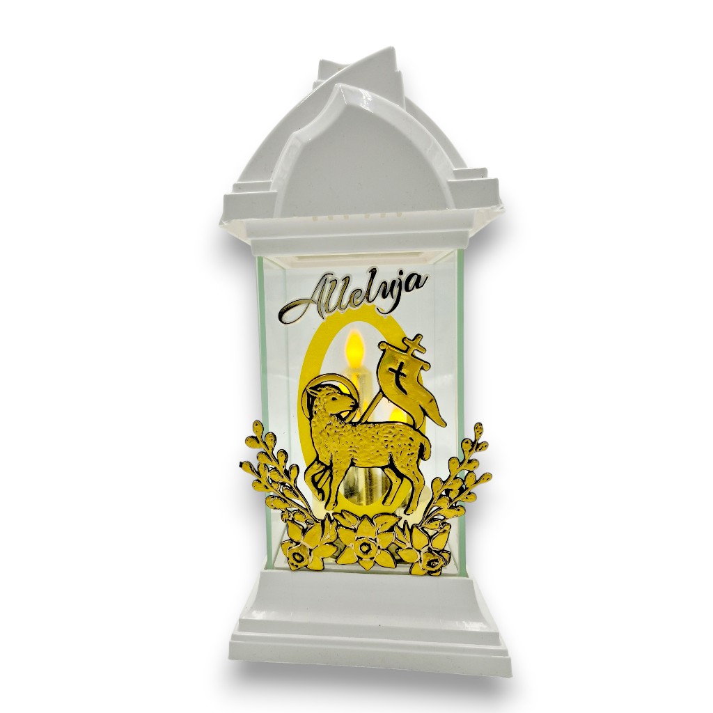 Biała kapliczka LED z barankiem 32 cm – Alleluja | Znicz LED