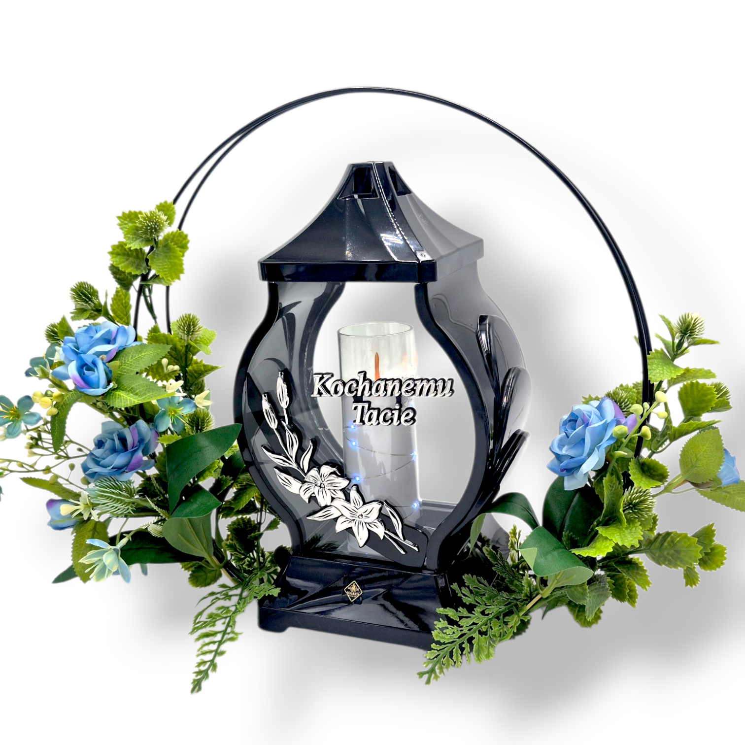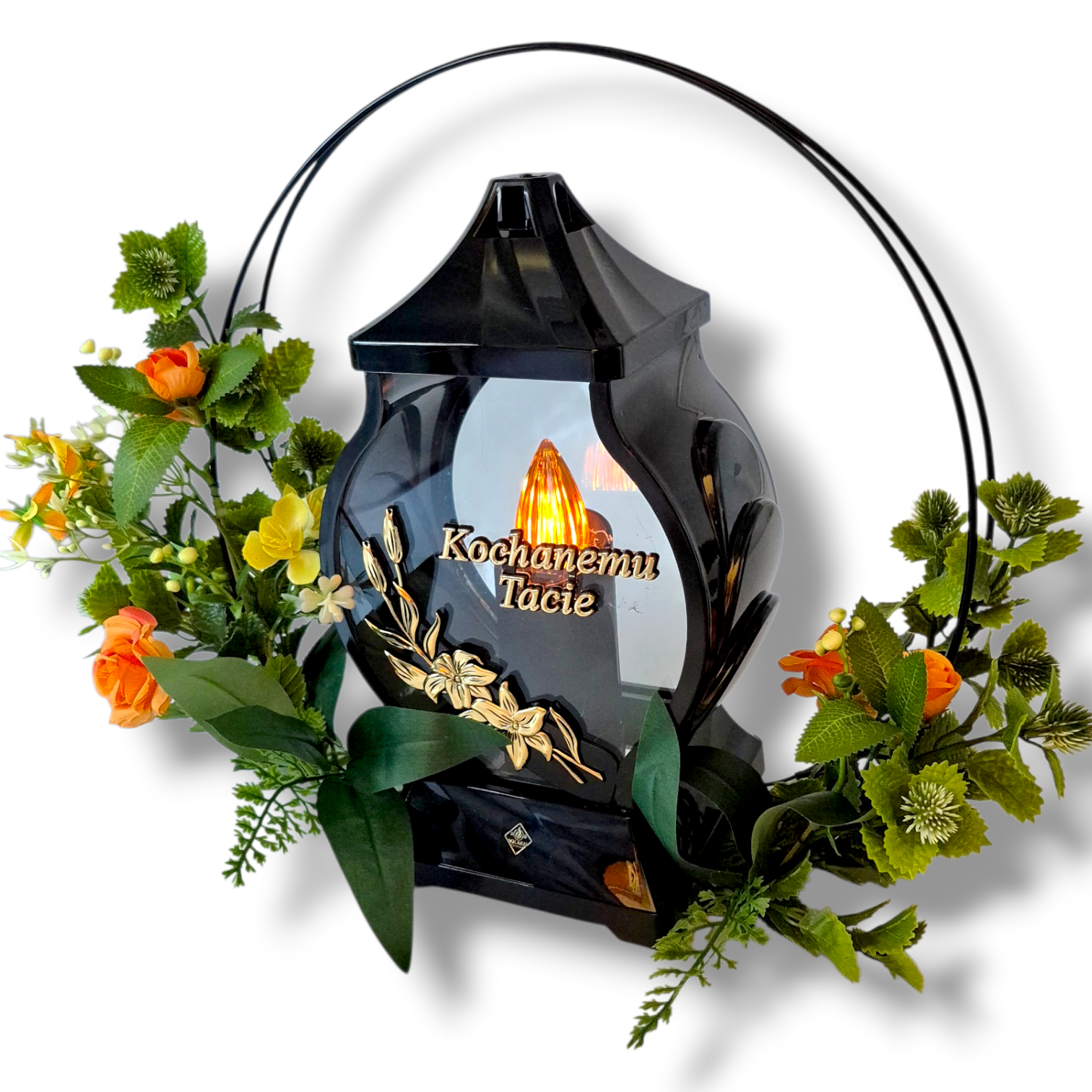 Elegancki znicz Kochanemu Tacie z dekoracyjną kompozycją kwiatową. Dekoracja nagrobna 2w1 z wkładem LED w komplecie – symbol pamięci o tacie.