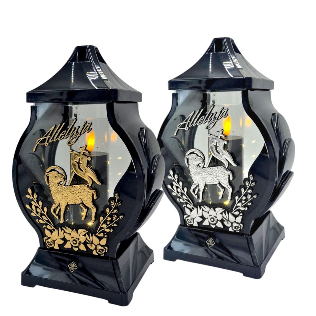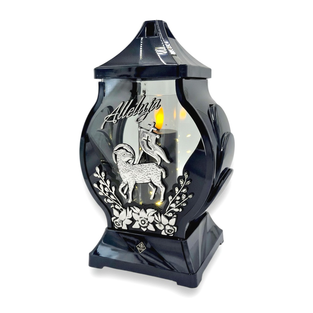 Znicz LED baranek Alleluja OBELIX Mini to elegancki i trwały znicz na grób o wysokości 29 cm, zaprojektowany z myślą o okresie wielkanocnym oraz całorocznym upamiętnieniu. Klasyczna, obła forma w kolorze czarnym została połączona z dekoracyjnym motywem baranka z chorągwią i napisem „Alleluja”, dostępnym w wariancie złotym lub srebrnym. Całość tworzy estetyczne i godne światło pamięci.