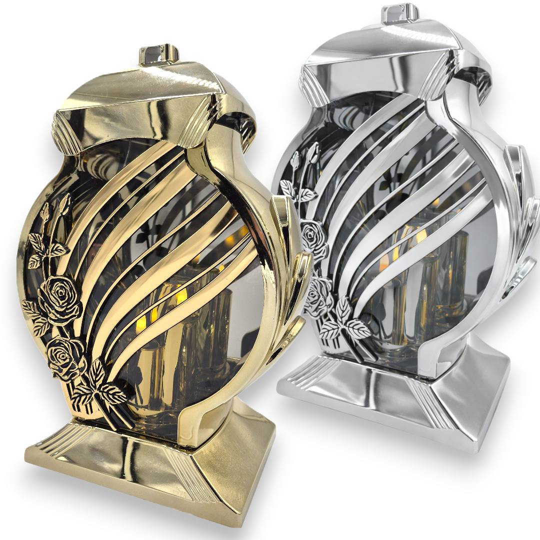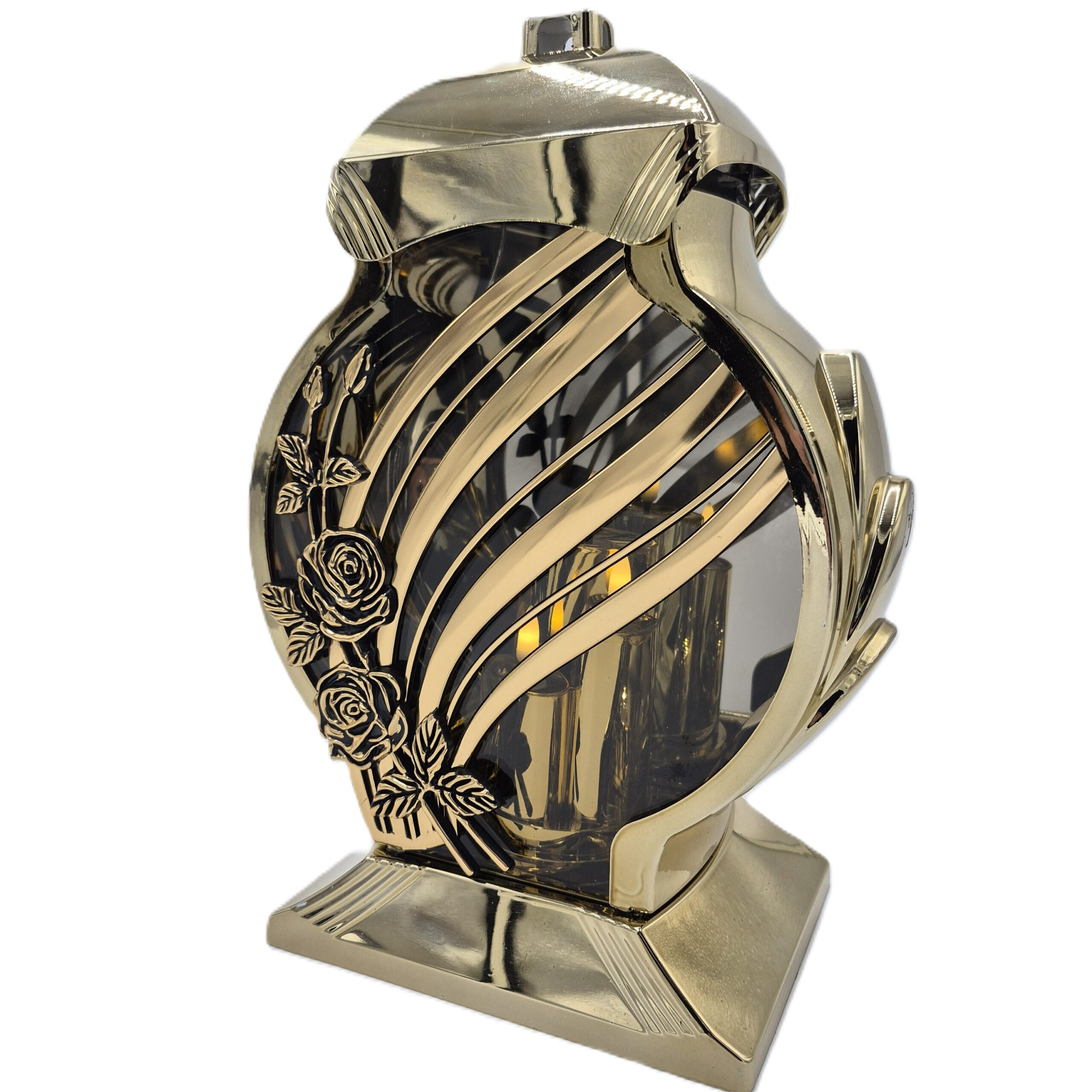 Znicz LED Rosa Lux 33×21 cm w kolorze złotym lub srebrnym. Elegancka forma z motywem róży. Przystosowany do wkładów LED i tradycyjnych