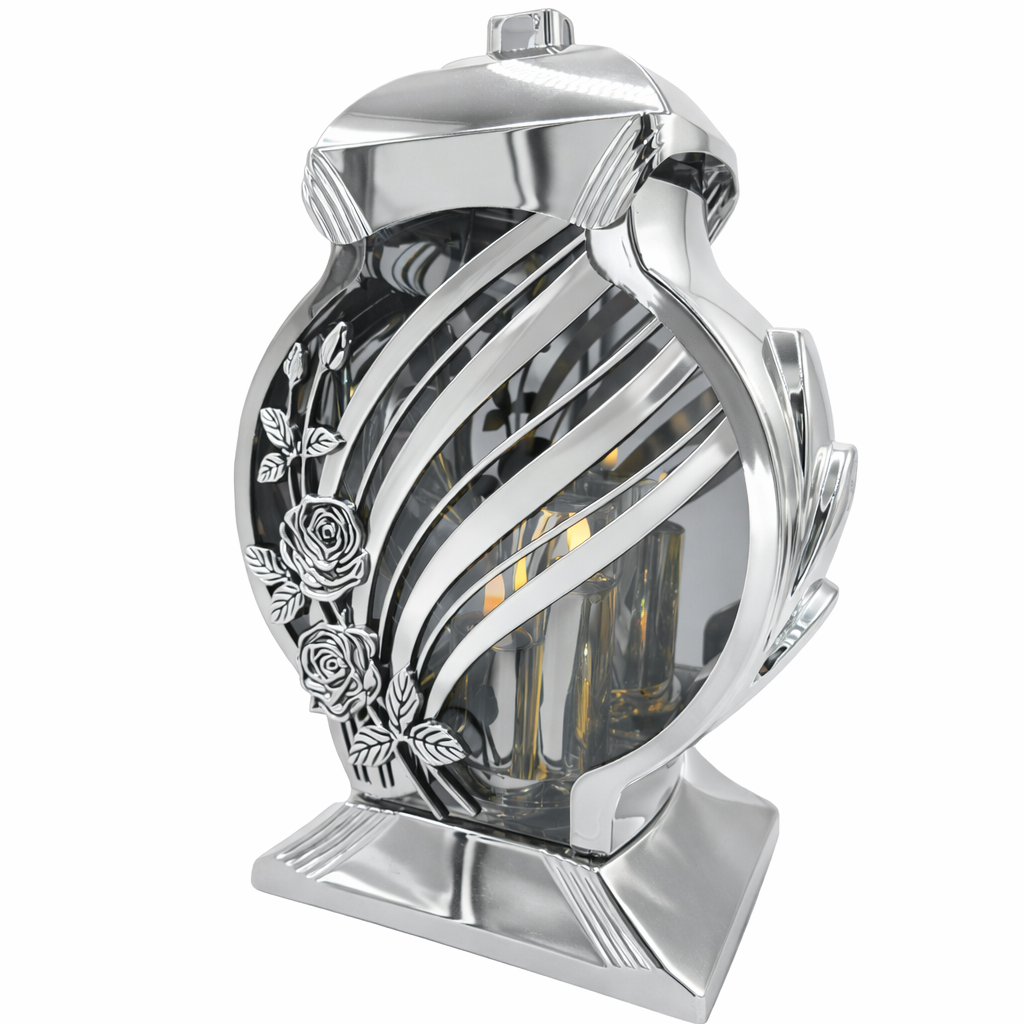 Znicz LED Rosa Lux 33×21 cm to elegancki model w wersji złotej lub srebrnej, wyróżniający się metalizowanym wykończeniem i dekoracyjnym motywem róży. Smukła forma prezentuje się reprezentacyjnie na pomniku i dobrze komponuje się zarówno z klasycznymi, jak i nowoczesnymi aranżacjami.