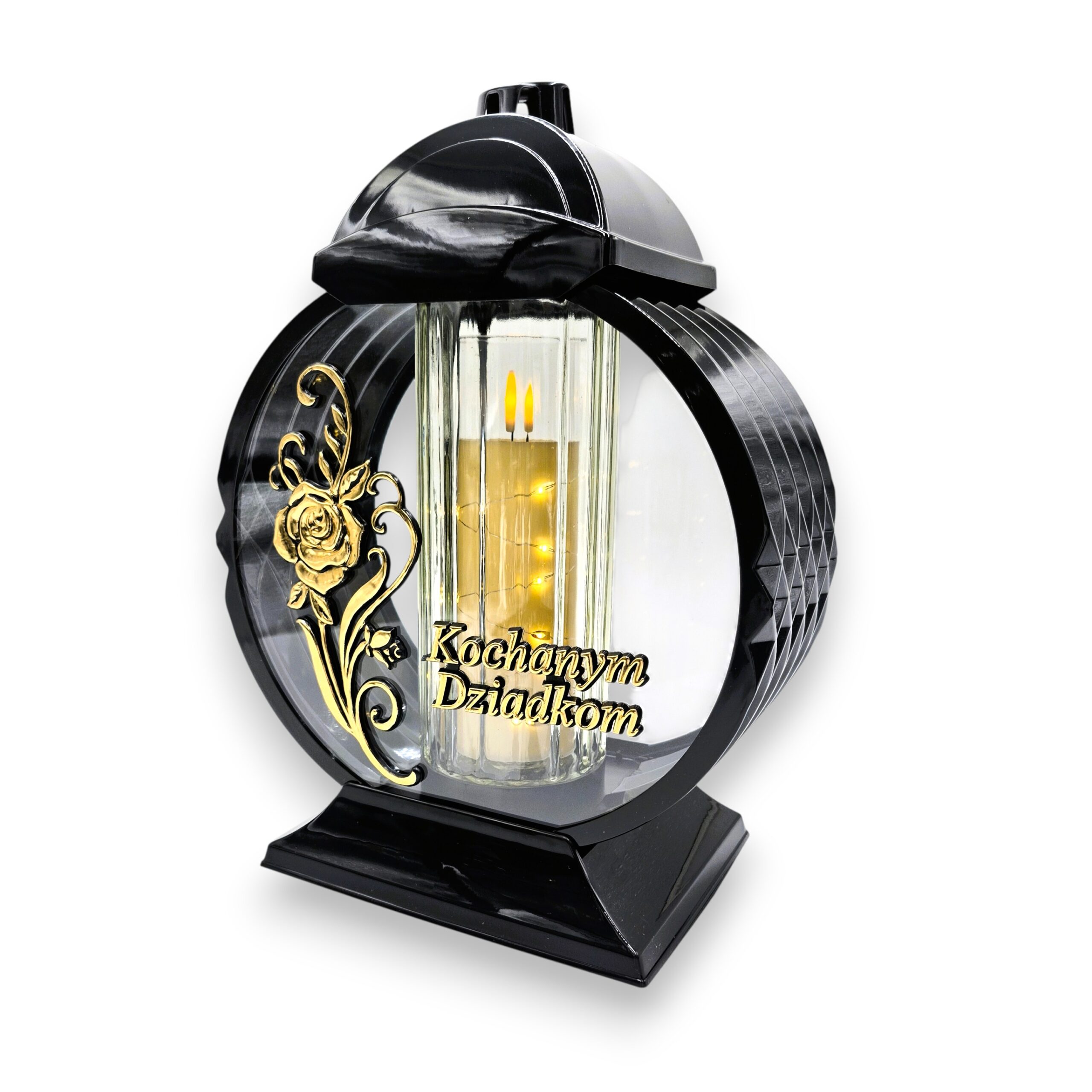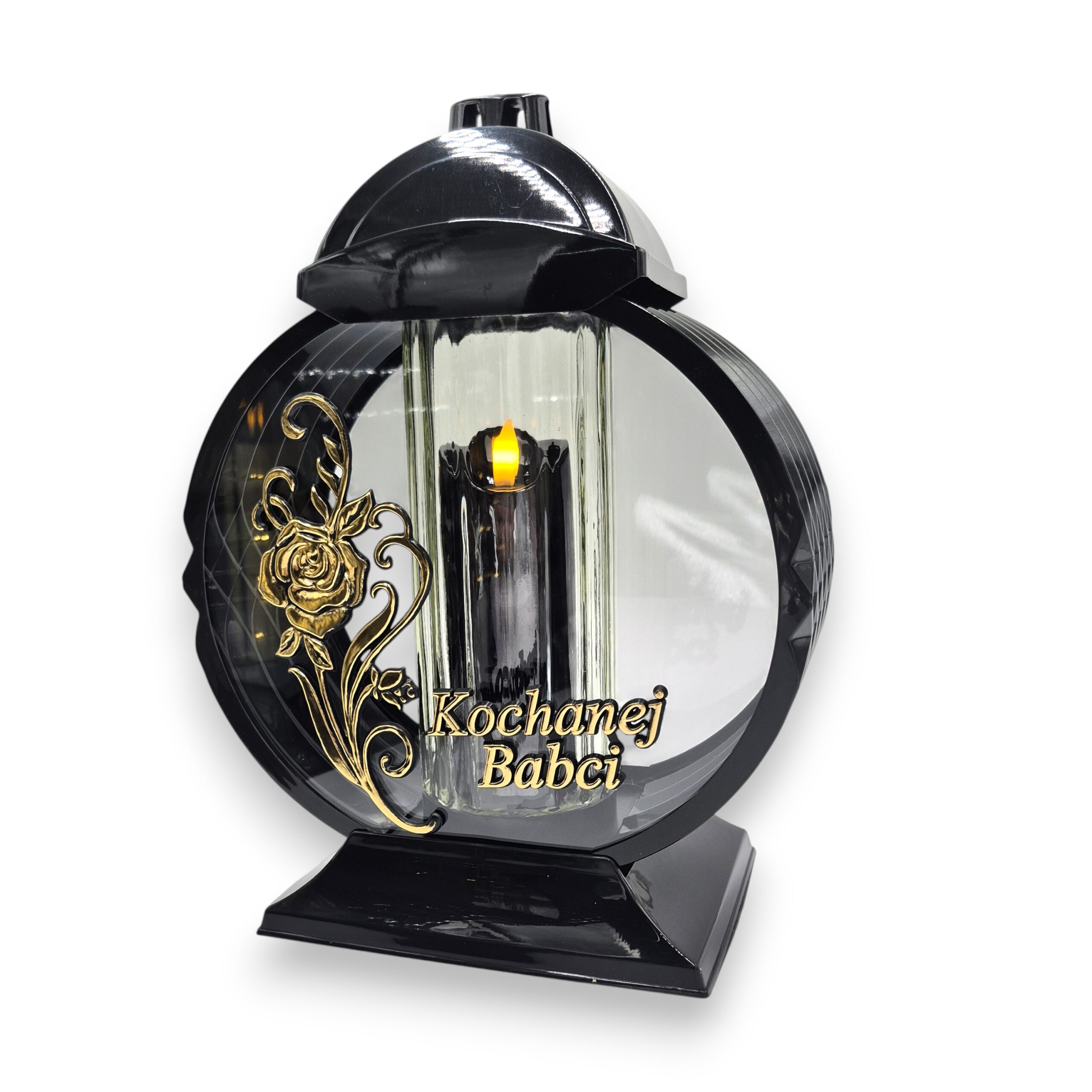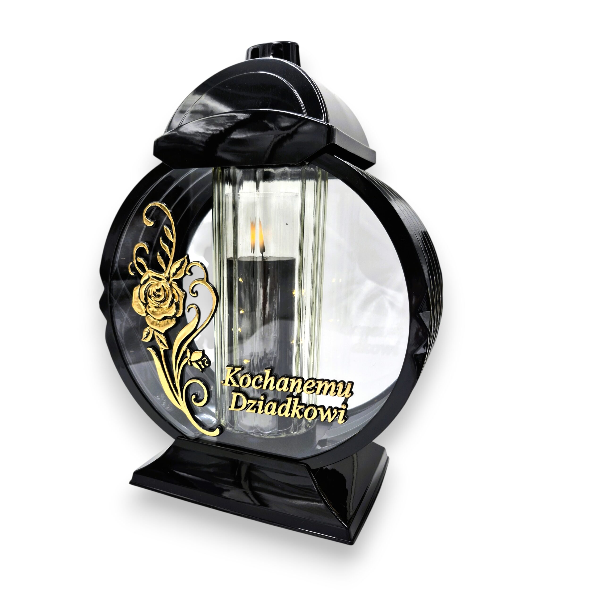 Elegancki znicz w formie medalionu o wysokości 32 cm, ozdobiony motywem róży i dostępny z dedykacją: „Kochanej Babci”, „Kochanemu Dziadkowi” lub „Kochanym Dziadkom”. Konstrukcja wykonana jest z trwałego PVC ,w środku znajduje się ciężka szklana tuba, znicz jest odporny na stłuczenia i wygodny w użytkowaniu, a przy tym prezentuje się estetycznie na nagrobku.