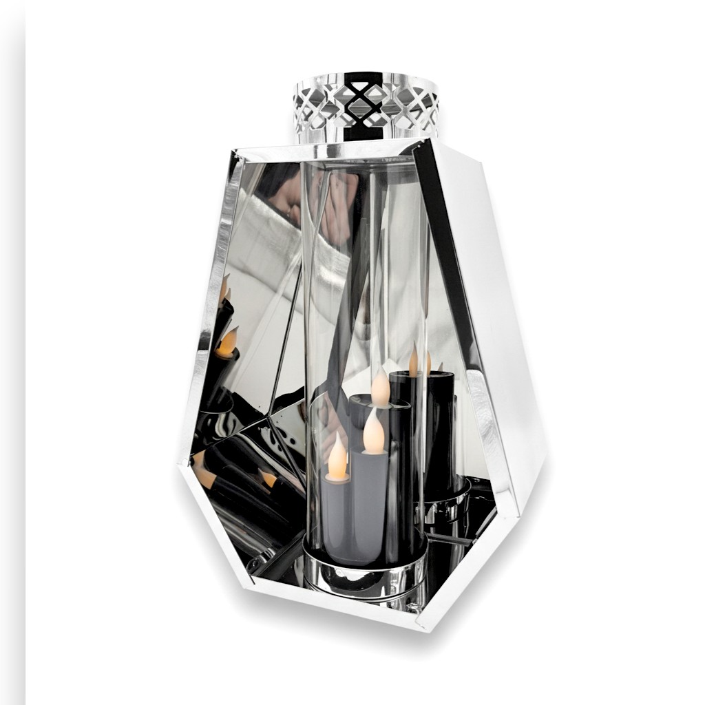 Znicz Romb 35 cm GLAMOUR to nowoczesny lampion nagrobny o wyrazistej, geometrycznej formie. Połączenie połyskującego metalu i szklanej tuby tworzy elegancki efekt światła oraz trwałą, prestiżową dekorację na cały rok.
