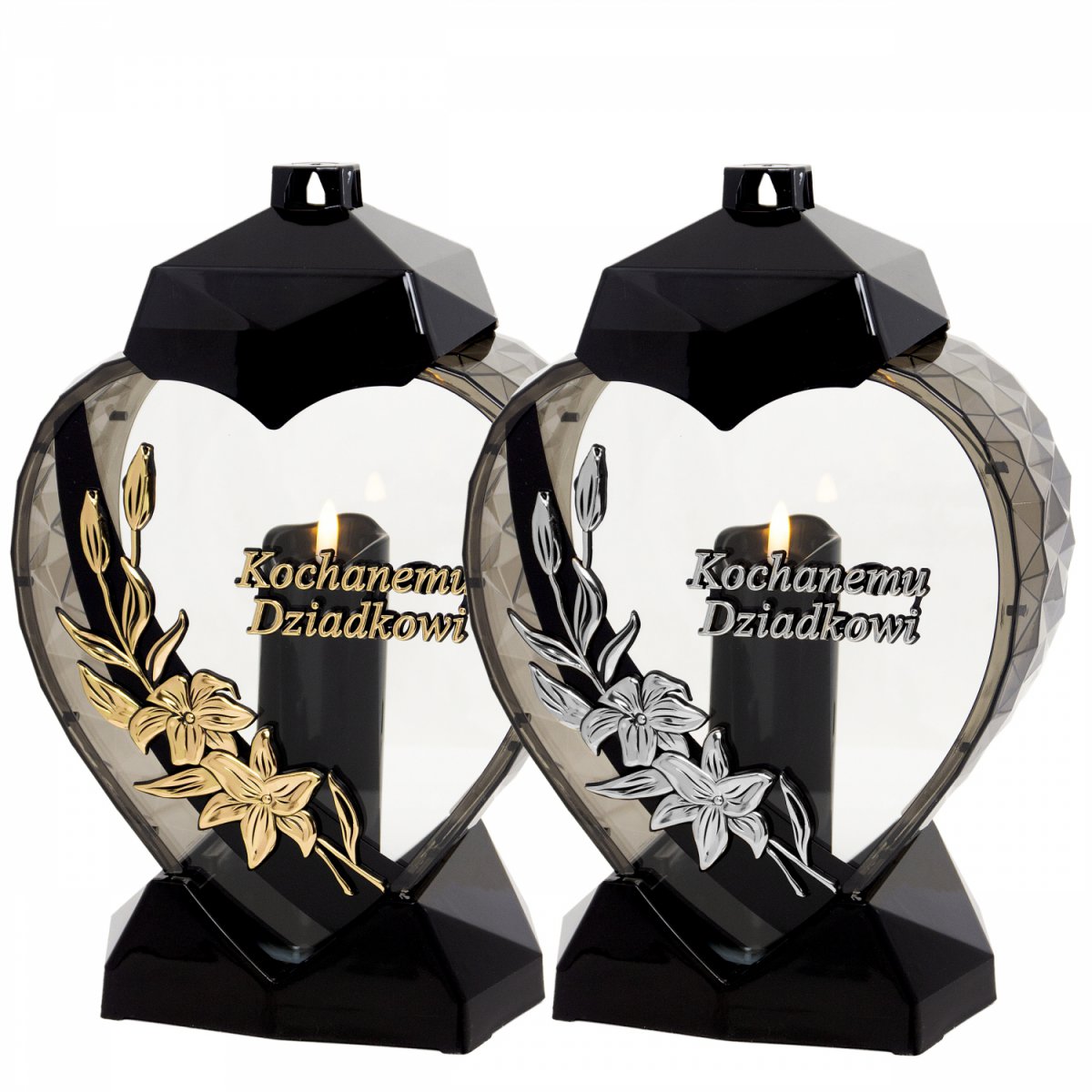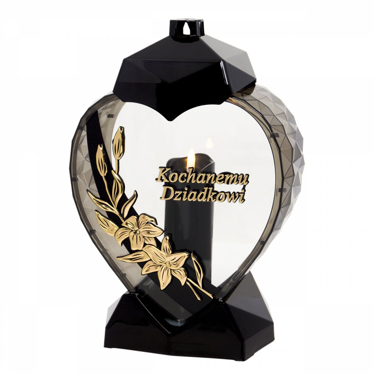 Elegancki znicz w kształcie serca z dedykacją „Kochanym Dziadkowi” i dekoracją kwiatów. To wyjątkowy lampion nagrobny, który łączy klasyczną formę z subtelnym, ozdobnym wykończeniem. Przeznaczony jako symbol pamięci i wdzięczności dla Dziadka.