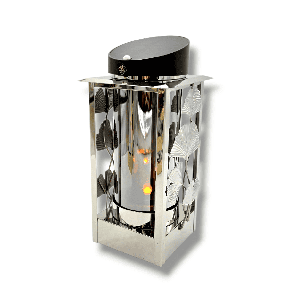 Kompaktowa wersja naszego flagowego modelu, Lampion LUX 3D, to idealne rozwiązanie na każdy nagrobek. Wykonany ze stali nierdzewnej, zdobiony misternym motywem liści miłorzębu, łączy w sobie biżuteryjny design z najnowocześniejszą technologią. Wyposażony w system Dzień i Noc (24h), inteligentny czujnik ruchu oraz realistyczny efekt płomienia 3D.