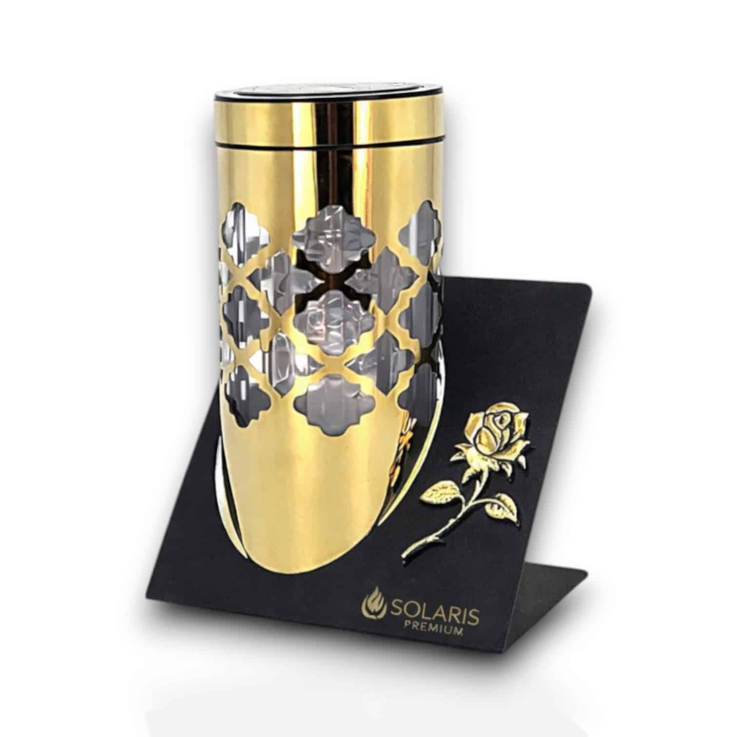 Znicz solarny PARIS w złotym wykończeniu premium z ażurowym wzorem i czarną podstawą z różą. Ładuje się w dzień i świeci do 24h na dobę (w zależności od nasłonecznienia), bez ognia i bez brudzenia.