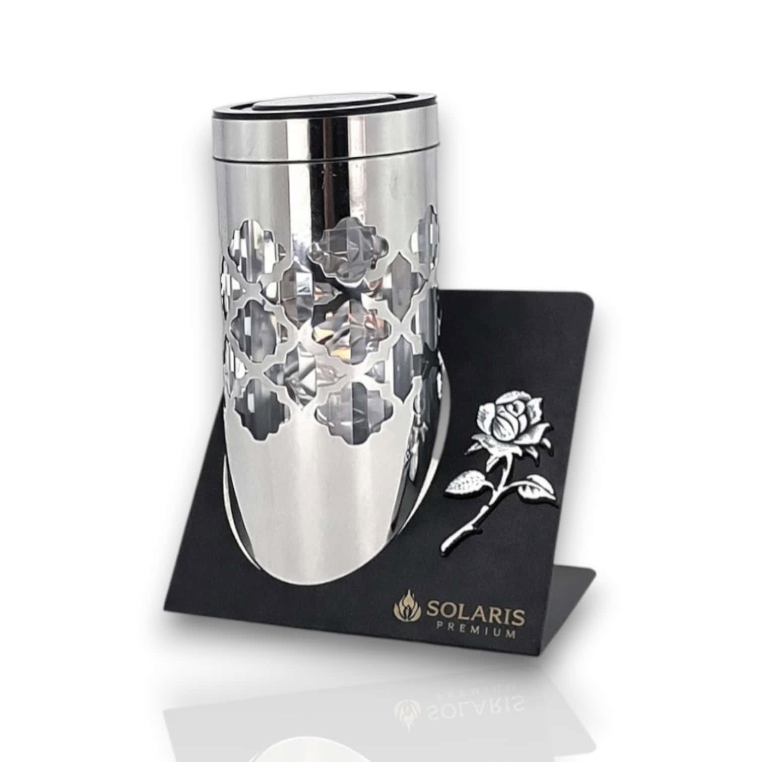 SOLARIS PARIS wyróżnia się smukłą formą, ażurowym wzorem i solidną metalową konstrukcją. Lustrzana obudowa (stal chromowana) nadaje mu charakter premium/glamour, a stabilna podstawa ze stali malowanej proszkowo pomaga utrzymać znicz w miejscu.
