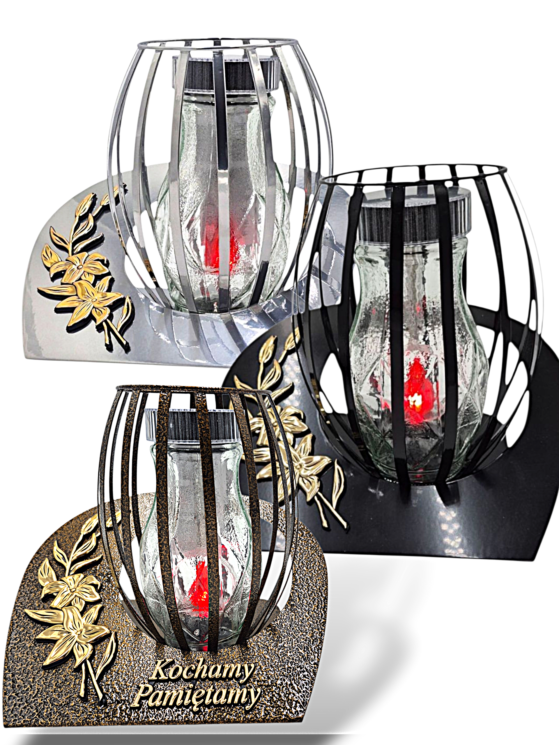 Solaris METAL LUX to kolekcja zniczy solarnych klasy premium, łącząca nowoczesną formę z delikatną symboliką. Szklany wkład został osłonięty elegancką metalową konstrukcją, która przypomina subtelną latarnię i pięknie eksponuje światło po zmroku. Całość uzupełnia dekoracyjna podstawa z kwiatowym zdobieniem, nadająca kompozycji ciepła i godnego charakteru.