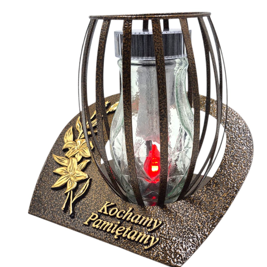 Solaris METAL LUX to znicz solarny premium z metalową osłoną w formie latarni i dekoracyjną bazą z kwiatowym motywem. Kilka wersji kolorystycznych, także z napisem „Kochamy Pamiętamy”.