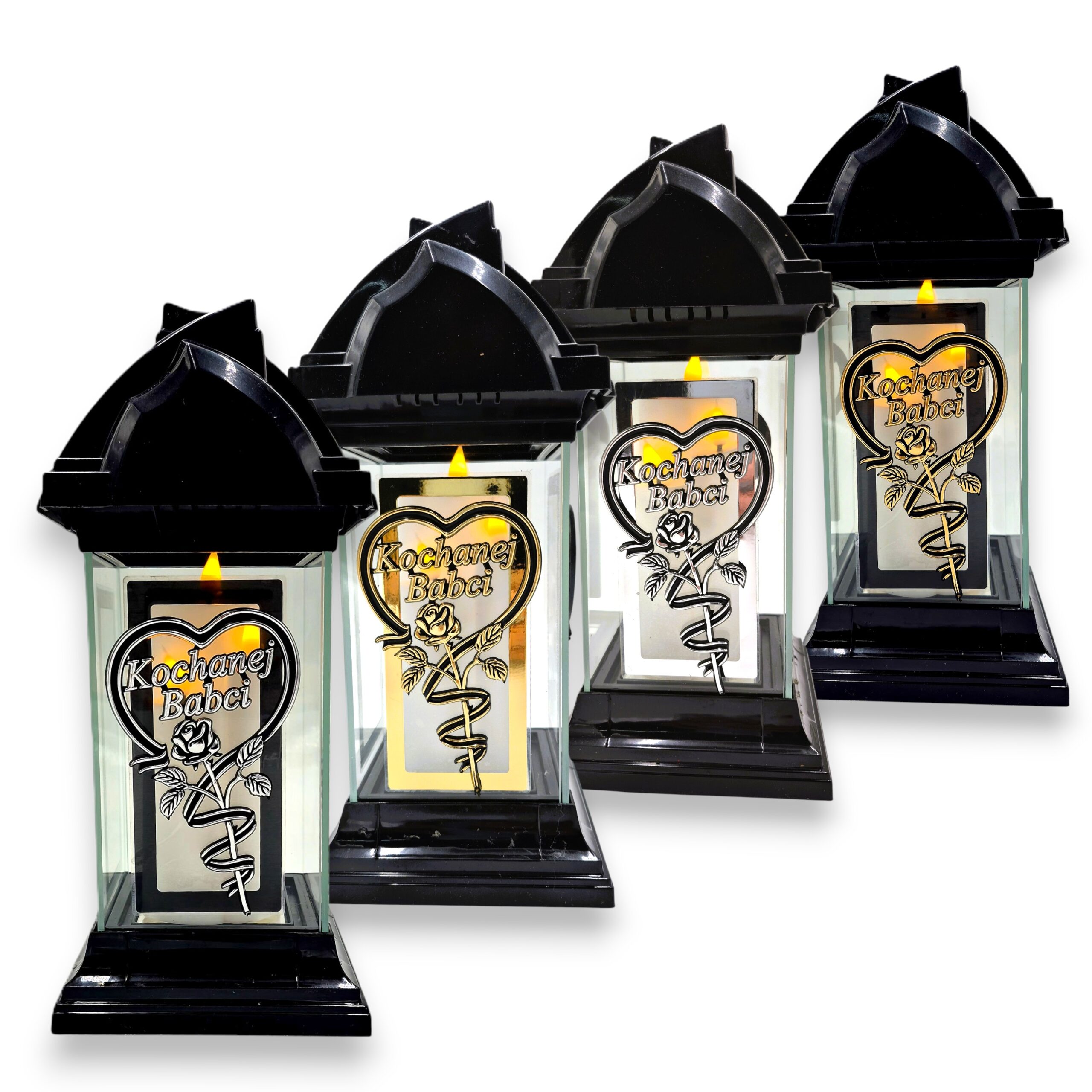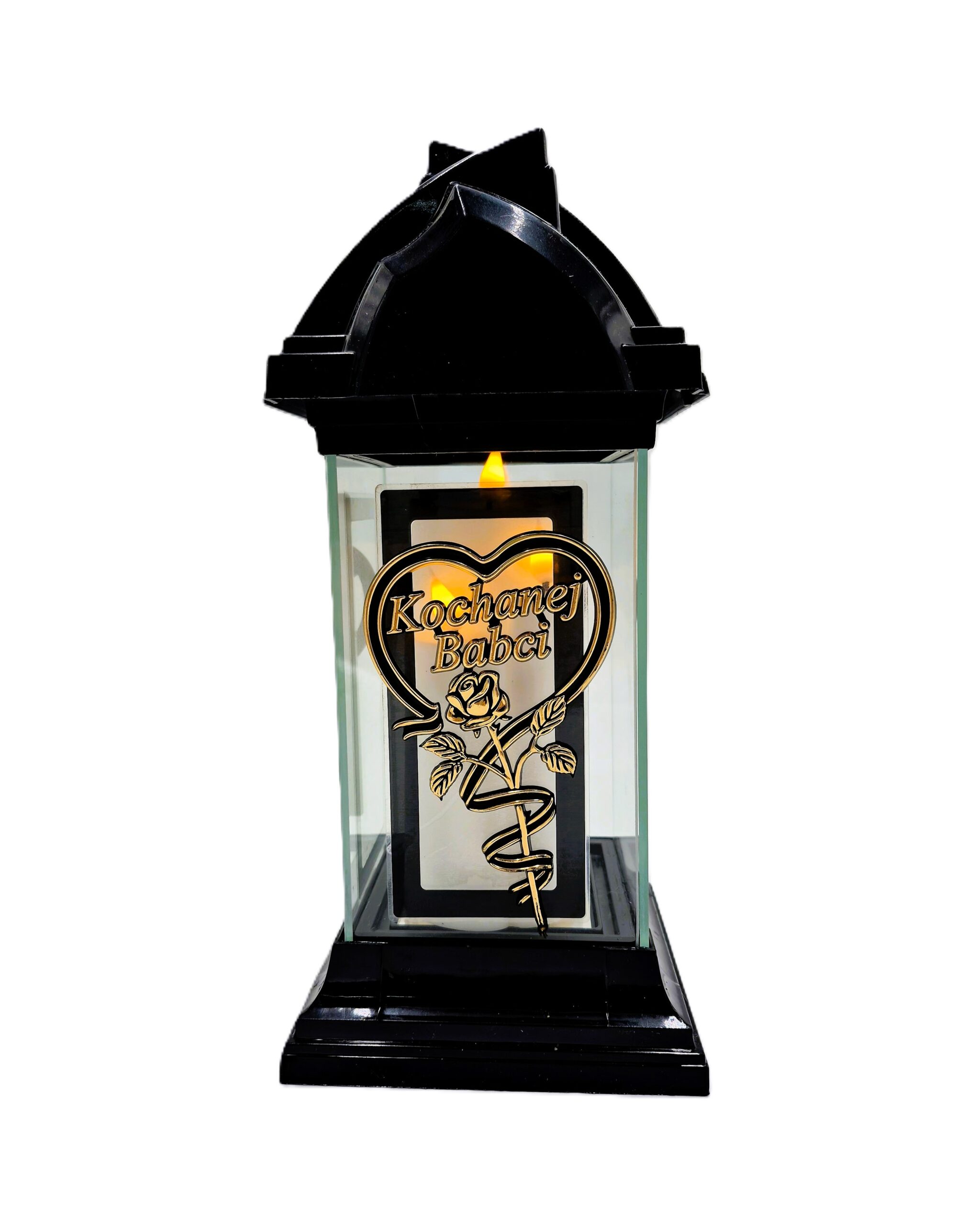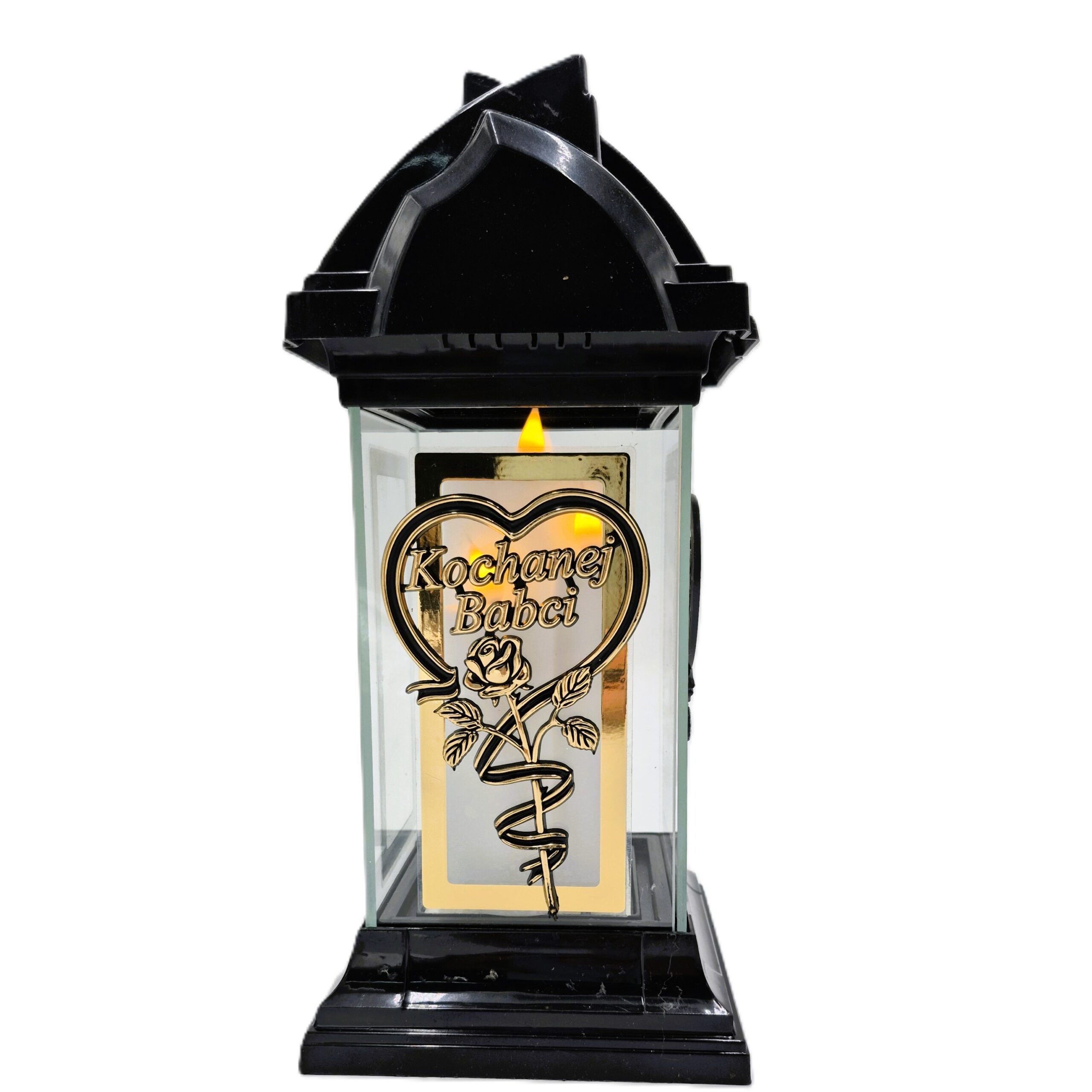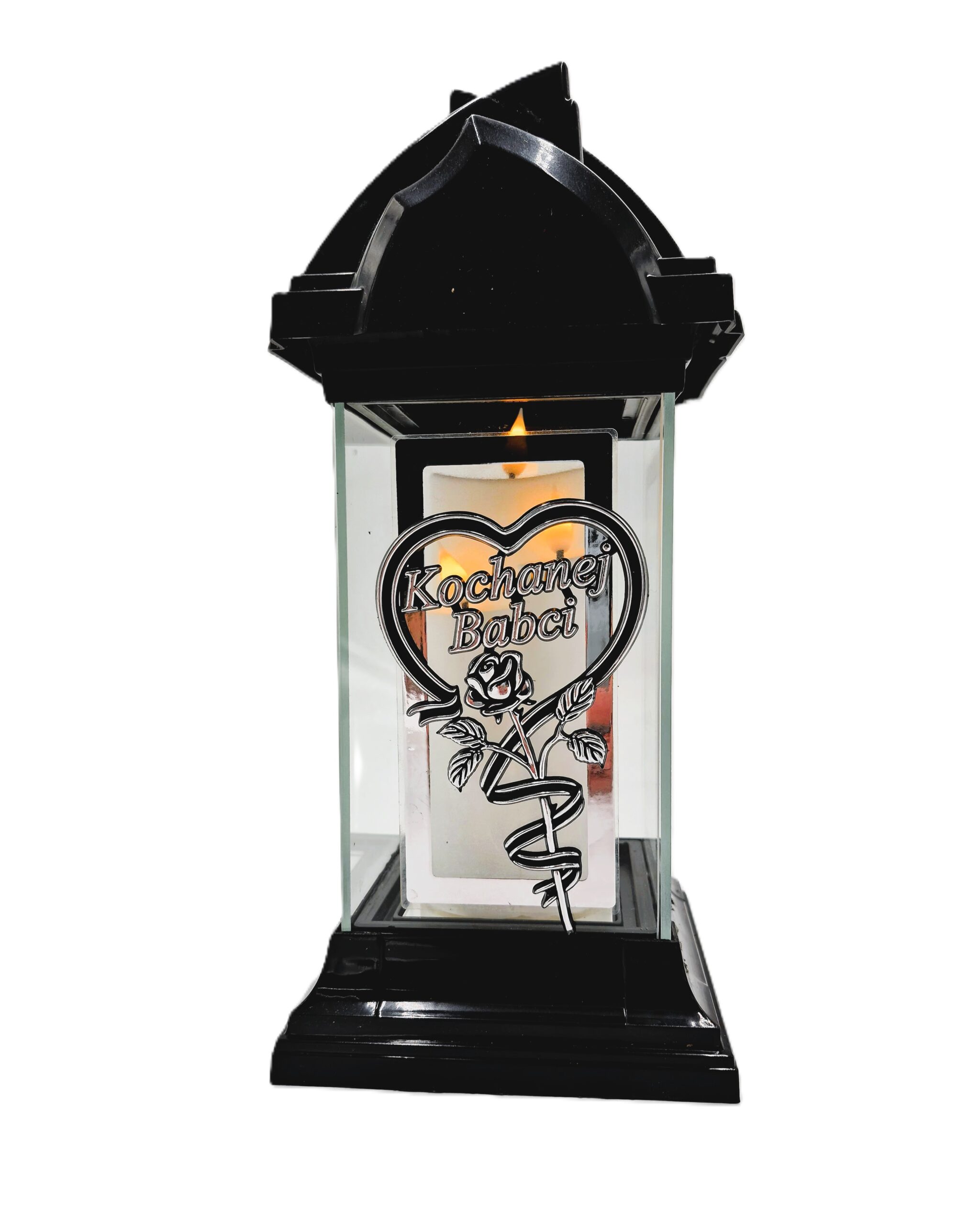 Elegancki znicz w formie szklanej kapliczki z dedykacją „Kochanej Babci”. Naklejka w formie  chromowanej ramki z motywem serca i róży,  pięknie odbija światło i nadaje całości wyjątkowo estetyczny, nowoczesny wygląd.
