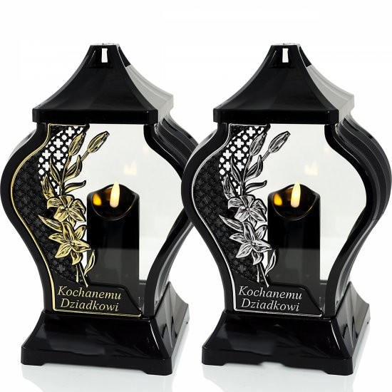 Elegancki znicz w formie szklanego lampionu typu FARAON z dedykacją „Kochanemu Dziadkowi”. Klasyczna czerń połączona z srebrnym zdobieniem kwiatów tworzy spokojną, ponadczasową kompozycję, która pięknie prezentuje się na nagrobku i podkreśla pamięć o bliskiej osobie.