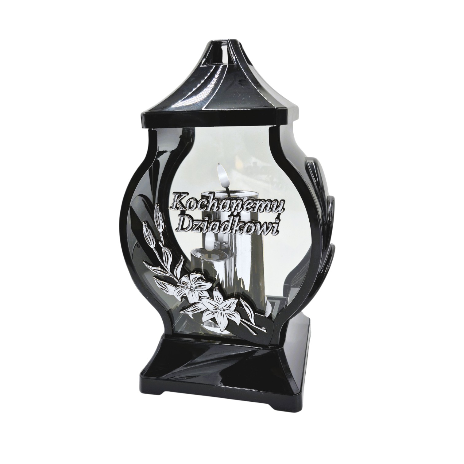 Elegancki znicz w formie szklanego lampionu z dedykacją „Kochanemu Dziadkowi” i subtelnym motywem kwiatów. Model Obelix Mini wyróżnia się klasyczną czernią oraz ozdobnym wykończeniem w wariancie złotym lub srebrnym, dzięki czemu prezentuje się bardzo estetycznie na nagrobku i pasuje do każdej aranżacji.