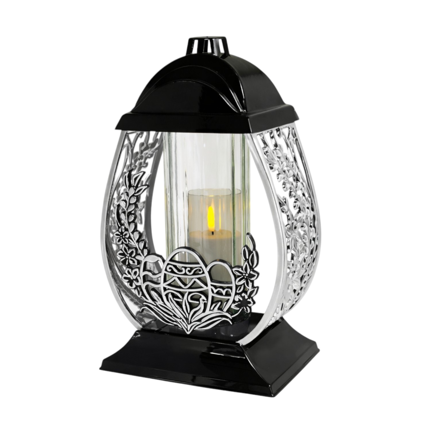 Znicz Wielkanocny Jajko Lux 32 cm w wersji złotej lub srebrnej. Elegancki lampion nagrobny z motywem pisanki i wykończeniem premium . Idealny na Wielkanoc