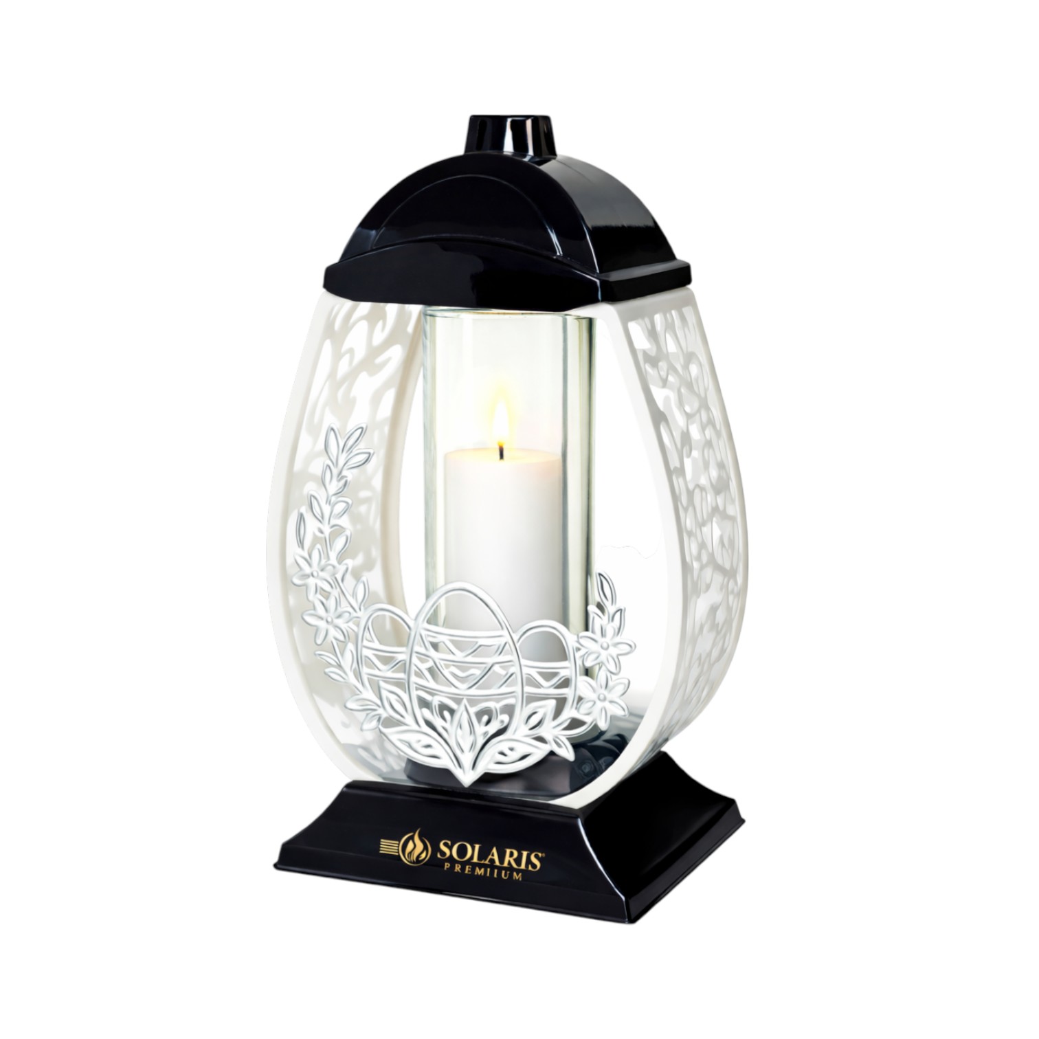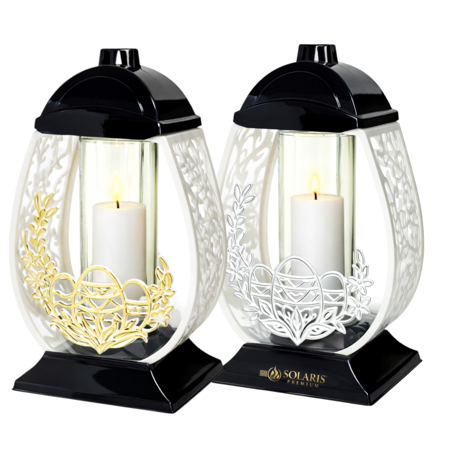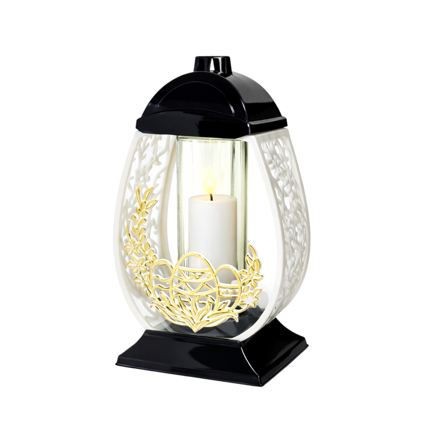 Znicz Wielkanocny Jajko Pisanka 32 cm w eleganckiej czarno-białej obudowie z aplikacją złotą lub srebrną. Szklana tuba wewnątrz oraz wkład LED gratis sprawiają, że model jest gotowy do użycia od razu po zakupie.
